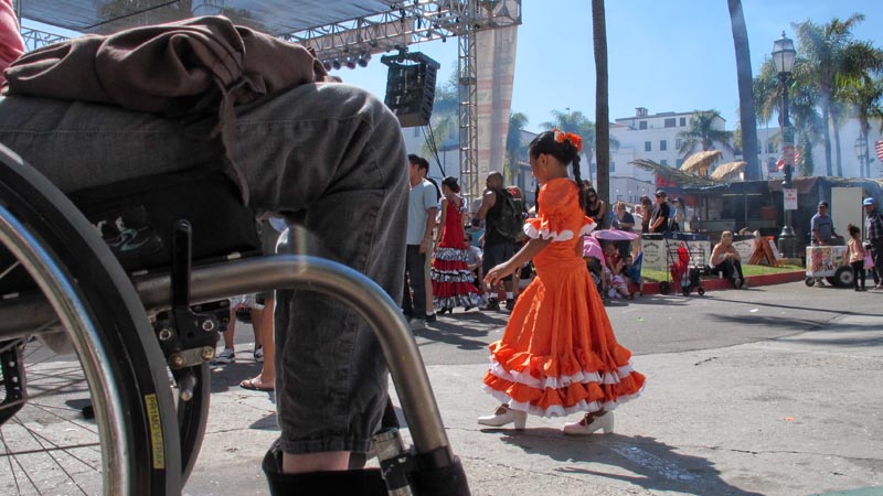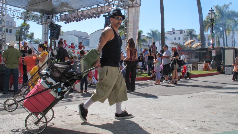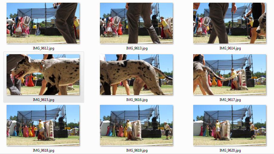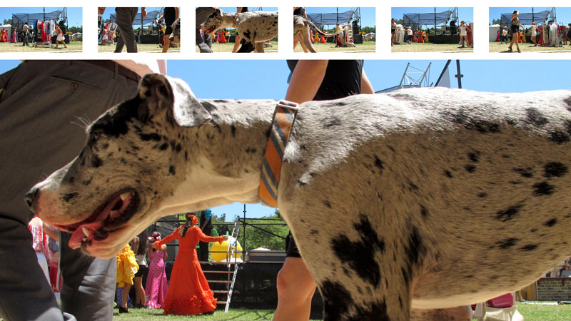 I go through three cards worth of images and see that people come in waves. People carrying folding chairs, mixed groups of the costumed with the non-costumed, kids with giant puffy carnival prizes. There is a Dalmatian mix that walks really close to the camera. He goes slowly enough that I could put the pieces together into one long dog.